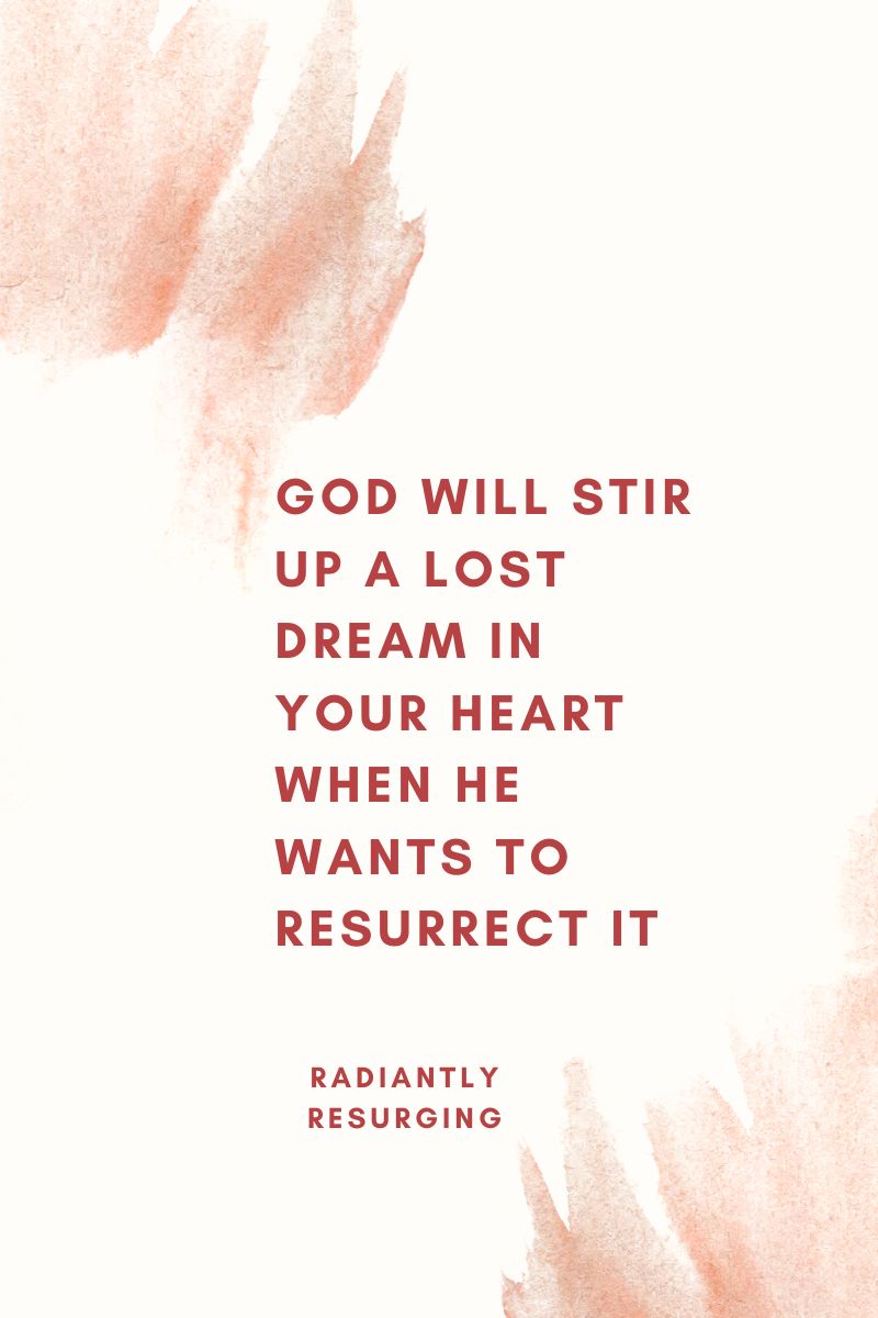 The number one way God will resurrect the dead dream is when you have a stirring in your heart. All of a sudden you will have a desire for the things that you had let go of. You will be drawn to it. And even the things you used to think about will all come back to you. God tells us that He never does anything until He reveals it. Therefore, He will stir it in your heart. What I want to encourage you is not to run away from that desire. It might even feel like you are unstable in your ways. But just lean into it. Stir it up once more. The beauty of God is that He will stir the desire in a way that will be unique to you.