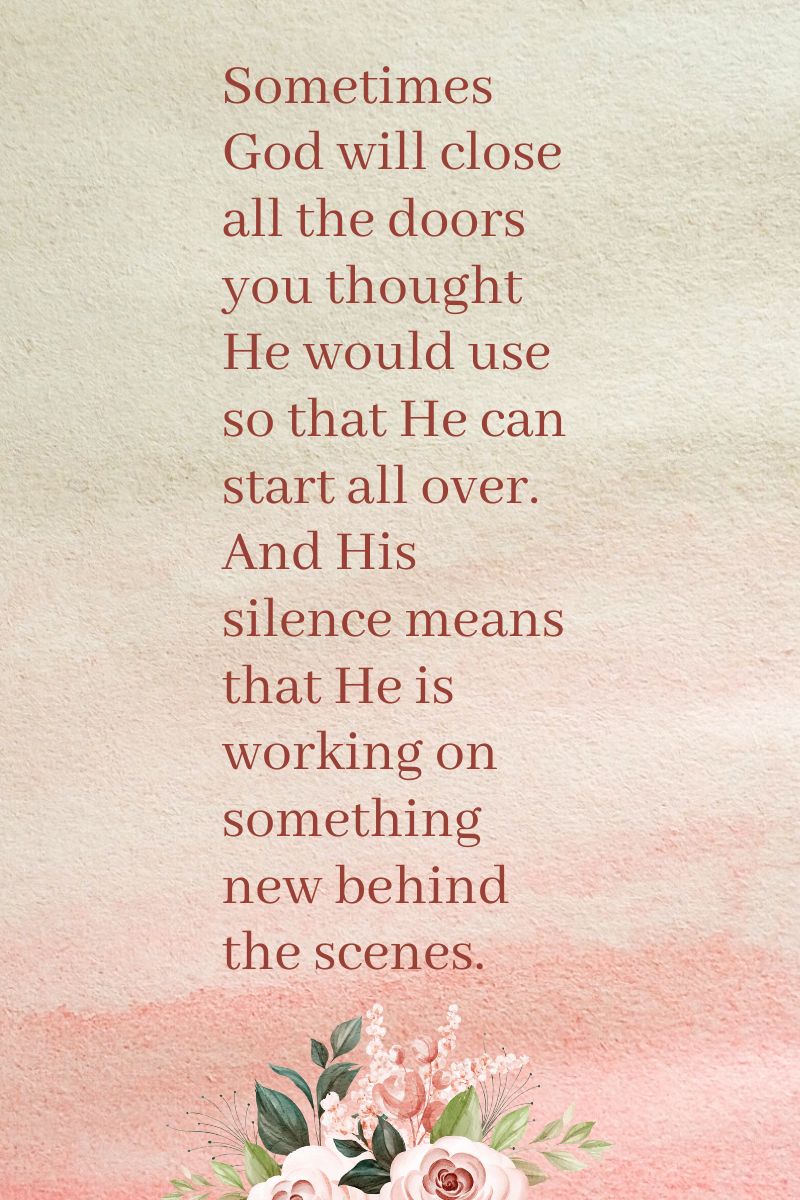 Sometimes God will close all the doors you thought He would use so that He can start all over. And His silence means that He is working on something new behind the scenes. Does it look like your back is against the wall? Have you hit rock bottom? Maybe God has something grand and new that He has in store for you. Will you give Him room to take the lead? Make room for the new