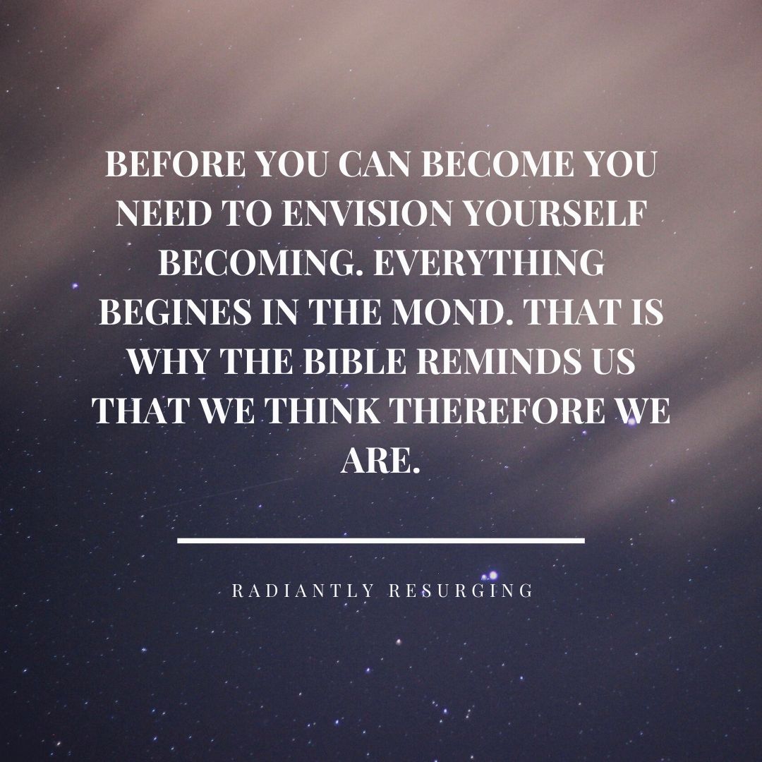 Envisioning yourself gives you the road map to reinvent yourself. Having clear goals gives you the road map you need to become who you want to be. Simply saying you want to change without having an end goal in mind will not help you reinvent yourself. So identify the qualities you want to embody, write them down and envision yourself becoming. After all it all starts in the mind. That is why Paul tells us in Romans 12:2 that transformation comes with the renewing of your mind. And seeing yourself possess these qualities yet one way you can renew your mind.