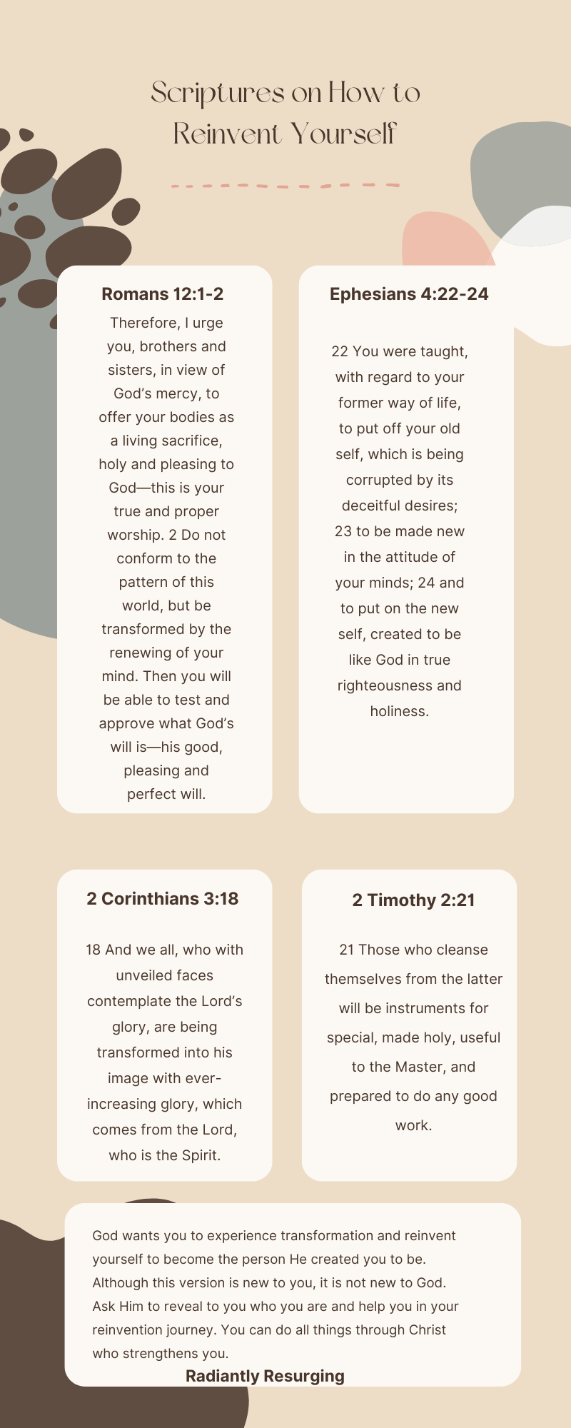 You don’t have to reinvent yourself alone. The Holy Spirit already knows what your best version looks like. He knows you inside out and knows who God created you to be. So invite Him in and allow Him to take center stage. He does not want you to go on this journey alone. So why not give Him a chance to help you?