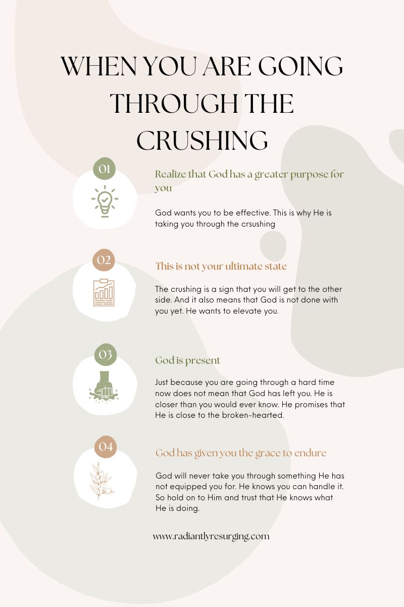 Maybe you have been overwhelmed with what you are going through that you feel like this is the best you are ever going to be. Has the fire been so hot and the crushing been so long that you think there is nothing good that will ever come out of this? Today be encouraged that as long as you are being crushed, God is not done with you. Yes, I know the heart hurts but when you hold on just a little longer, you will get to the other side of the glorification. The end goal is for God to redeem and restore and also for Him to be glorified.